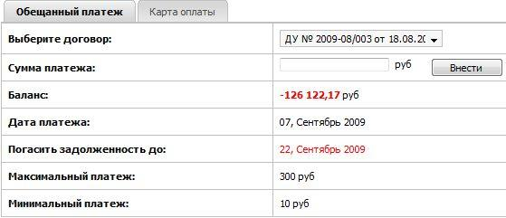 На открывшейся странице появится таблица «Обещанного платежа» (рисунок 3). Выберите договор и внесите сумму платежа в соответствующем разделе. Обратите внимание в таблице на поля со значениями минимального и максимального платежа: